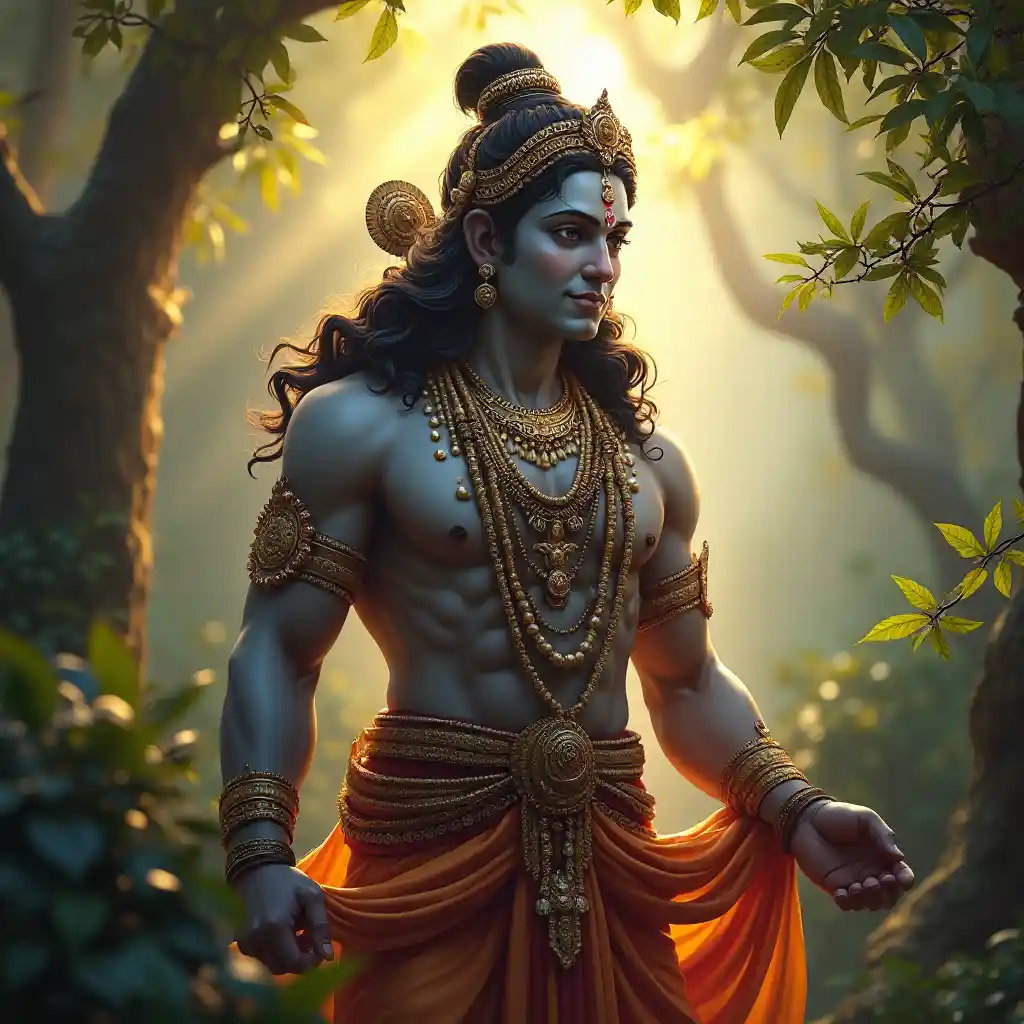 Bwana Rama, (majestic), rangi ya kupendeza, maelezo magumu, picha za kimungu, usemi wa utulivu, mandhari ya hadithi, mavazi ya mapambo, umuhimu wa kitamaduni, iliyozungukwa na kijani, (hali ya kiroho), mwanga wa joto, HD, kina.