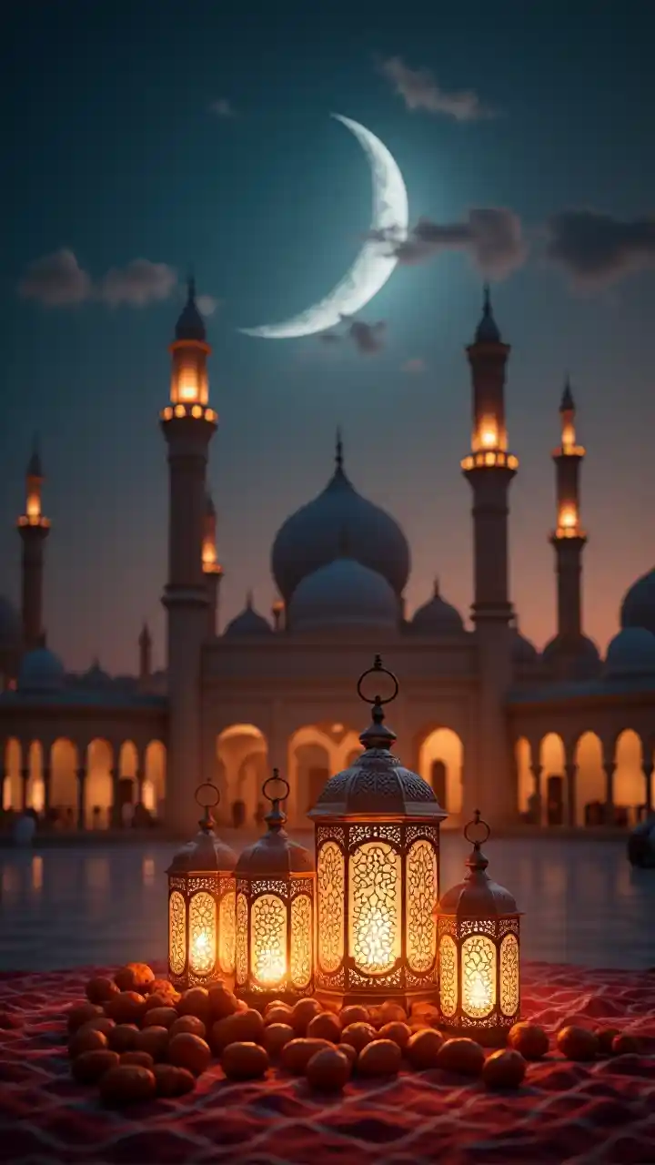Sherehe ya Ramadhani 2025, taa zilizoangazwa vizuri zinaangaza kwa upole, anga iliyoangazwa na mwezi inayoonyesha mwezi, usanifu wa msikiti wa nyuma, rangi za joto, mazingira ya utulivu, pamoja na vitu vya jadi kama michele na taa, azimio la juu, maelezo ya juu, kutafakari kwa amani juu ya kiroho na maele.