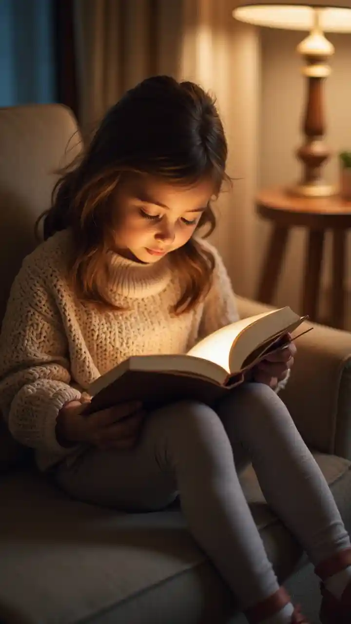 Wazia msichana mdogo aliyevaa sweta na sketi zenye kupendeza, ameketi kwenye kitanda akiwa na kitabu anachopenda. Akili yake iko katika hadithi hiyo, miguu yake ikiwa imeinama kando yake huku taa ikiangaza kwa upole na kwa uchangamfu.