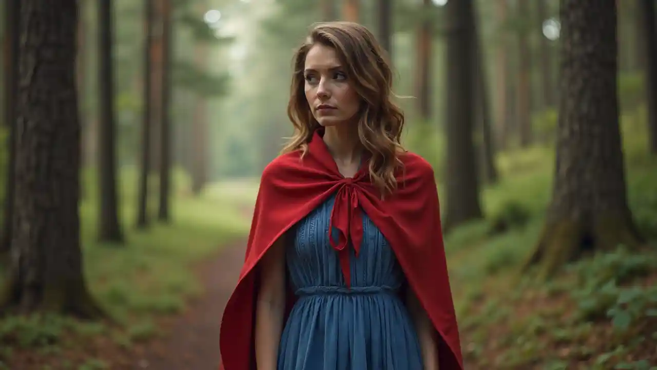 mwanamke katika kanzu nyekundu na mavazi ya bluu katika msitu, picha