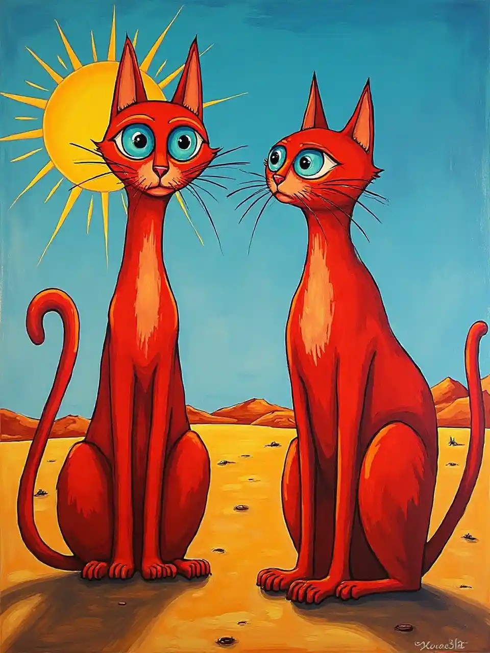 WilliamPunda weusi wenye macho makubwa ya bluu katika jangwa. Imechorwa kwa mtindo wa Salvador Dali. Jua kali sana na anga ya bluu. Miguu mirefu sana na midogo
