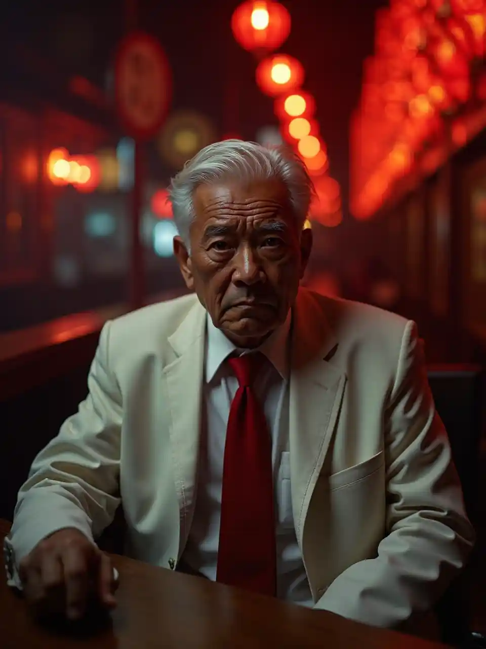picha ya sinema, eneo kutoka filamu, picha ya mtu wa Asia mwenye umri wa miaka 80 ameketi katika bar ya usiku, mafia ya Asia, baba wa mafia, uso wa hasira, koti nyeupe, nywele nyeupe, taa nyekundu Kichina juu ya background, kuzingatia uso, taa nyekundu, anga giza