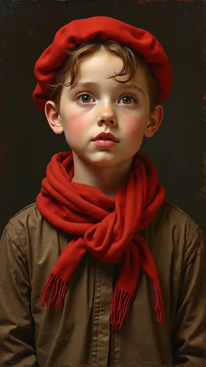mvulana painia mwenye kofia nyekundu shingoni na kofia nyekundu katika mtindo wa msanii Jan van Eyck.