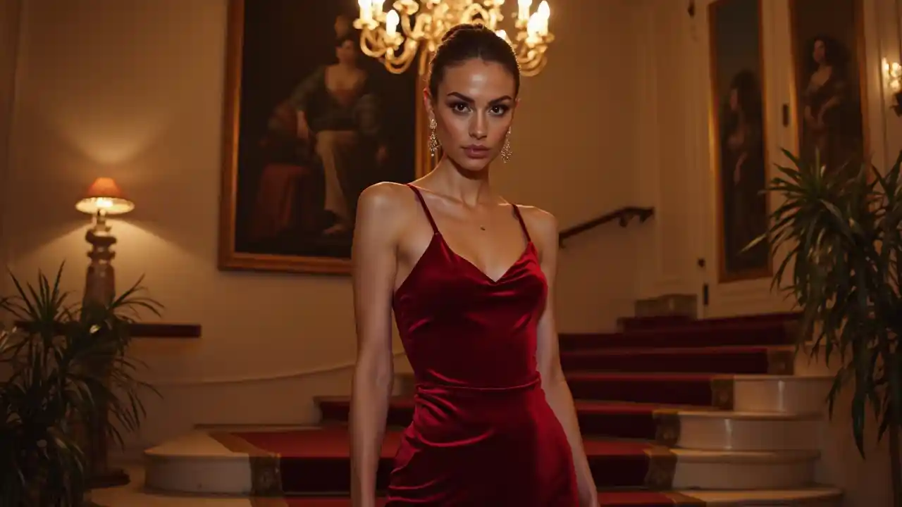Wazia mwanamke mwenye ngozi ya kauri aliyevaa vazi la rangi nyekundu, akiwa amesimama kwenye ngazi kubwa ya jumba la kifahari. Nuru ya chandeliers humwangaza kwa joto, ikionyesha uzuri wake.