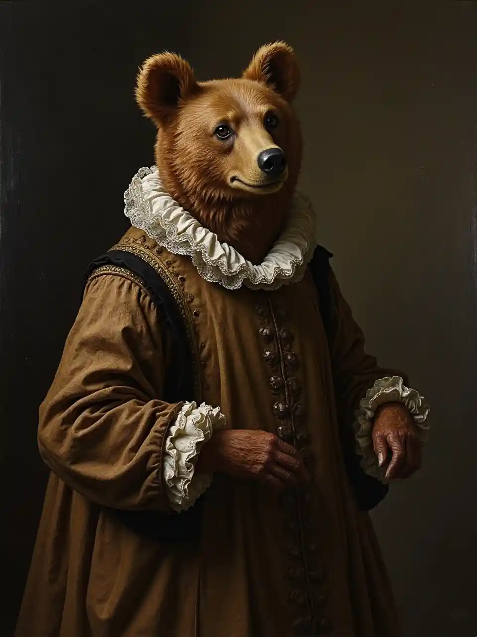 Mchoro wa kifahari wa Rembrandt Van Rijn, Mchoro wa dubu aliyevaa nguo za kawaida za wakati huo, mtindo wa uchoraji wa Renaissance, mtazamo wa 2/3, background rahisi, kiuno juu, kina sana, tofauti kubwa