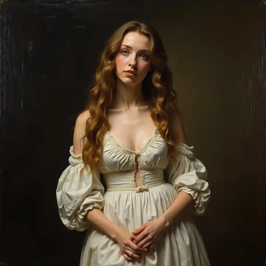 JackMchoro wa kifahari wa Rembrandt Van Rijn, picha kamili, kahaba, mwanamke mzuri mwenye nywele ndefu, mavazi meupe