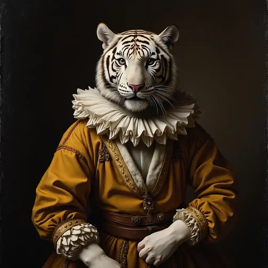 Mchoro wa kifahari wa Rembrandt Van Rijn, Mchoro wa simbamarara mweupe aliyevaa mavazi ya kawaida ya wakati huo, mtindo wa uchoraji wa Renaissance, mtazamo wa 2/3, background rahisi, kiuno juu, kina sana, tofauti kubwa