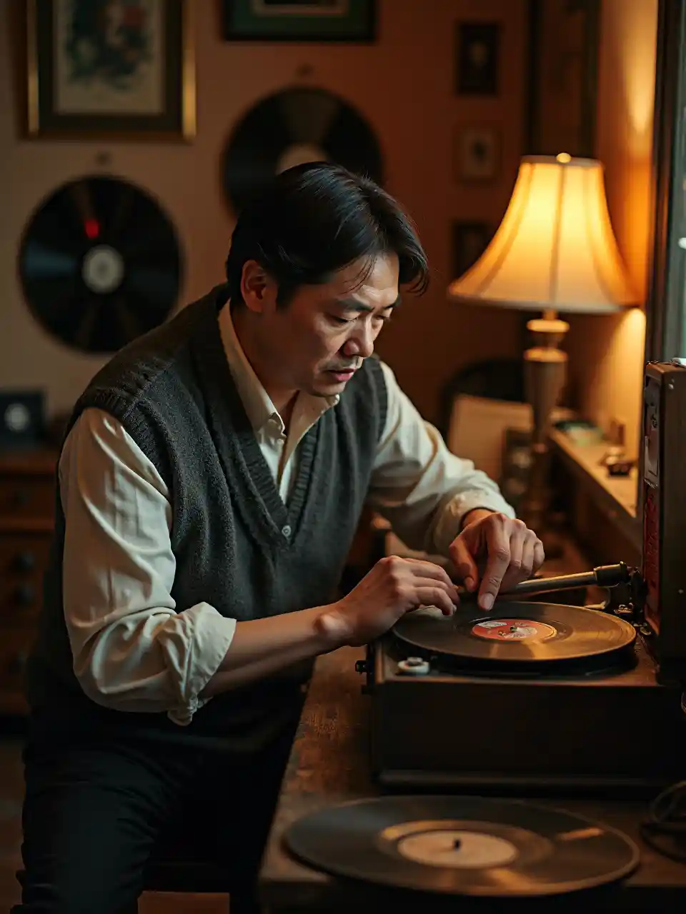 Akirudisha gramafoni ya zamani kwenye dari lenye starehe, mwanamume Msia mwenye umri wa miaka 55 hivi anaangaza akiwa na koti la sufu. Rekodi za kale na taa ya joto humweka ndani, mikono yake yenye ustadi na umakini wake unaonyesha shauku ya kiufundi na umaridadi wa kusikitika katika nafasi ya utu.