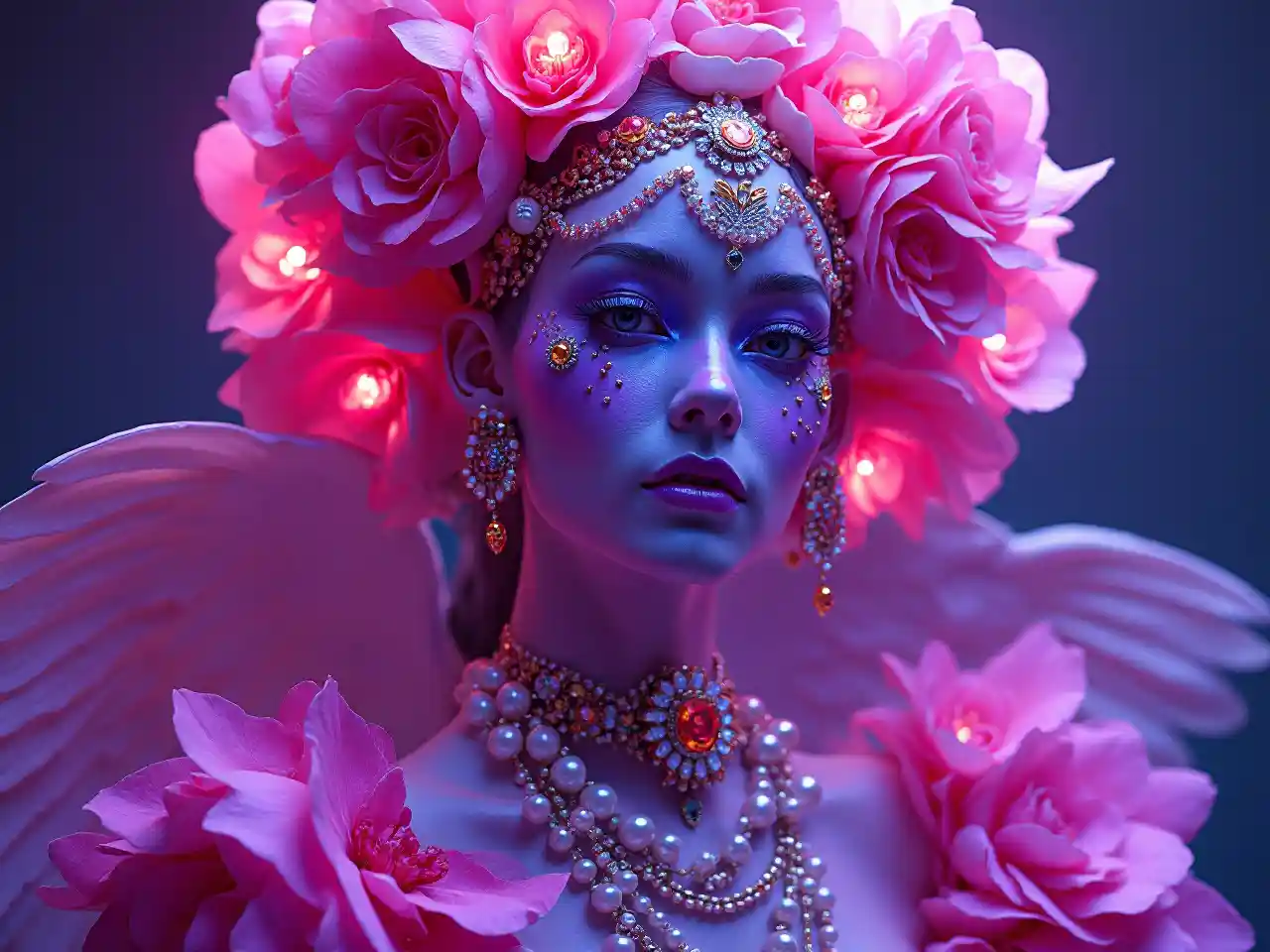 zambarau na nyekundu, retrofuturism, retro baadaye, 1970, zambarau mponyaji shaman, mkali, rangi rgb, dunia ndoto, Alexander McQueen Glazier, uso malaika, shaman, kutisha, arty pose, mtindo, vito kubwa, vito vya thamani, lulu kubwa, almasi kubwa nyeupe, retrofuturistic, kioo, marumaru, kioo, maua, maua makubwa, neon glow, giza, moody, tabaka ultra haute couture, high definition, high resolution, bold vibrant colors , kiasi taa, 8k, 3d, style na dior, style kwa njia, na Jimmy Marble na Takashi Murakami