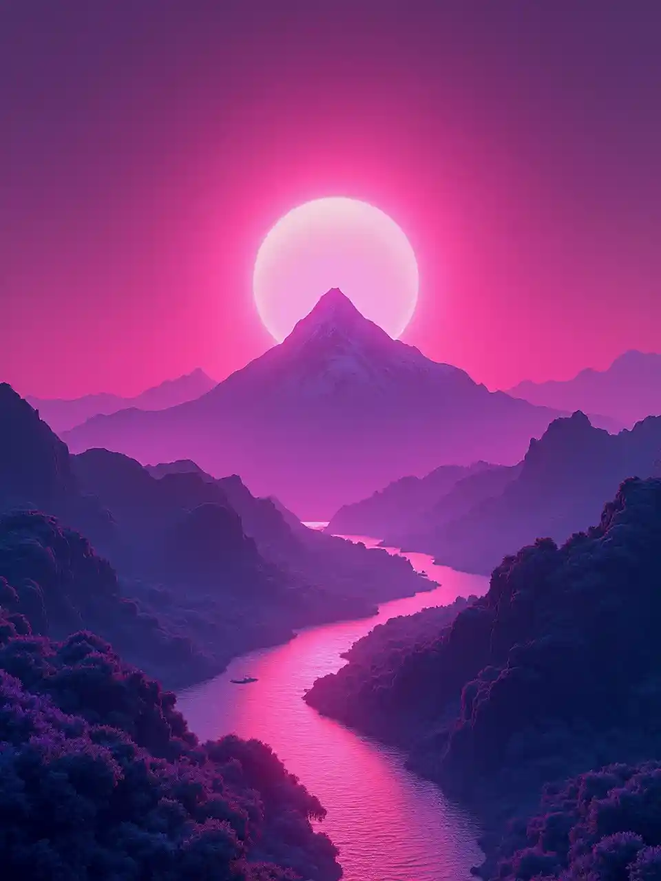 kupiga picha kitaalamu ya mandhari ya retrowave ya kifahari, taa za neon za zambarau, jua, mlima katikati, mtazamo wa ulimwengu, rangi ya juu, mwanga wa juu, mwanga wa kiasi