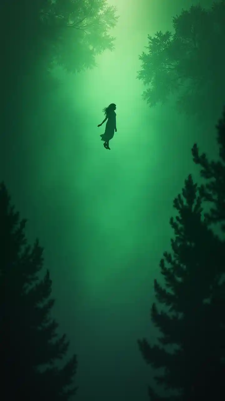 CooperNakala katika picha "Rise Above" Mwanamke katika ukungu wa kijani kuruka katika anga ya usiku. Msitu wa kijani-kibichi