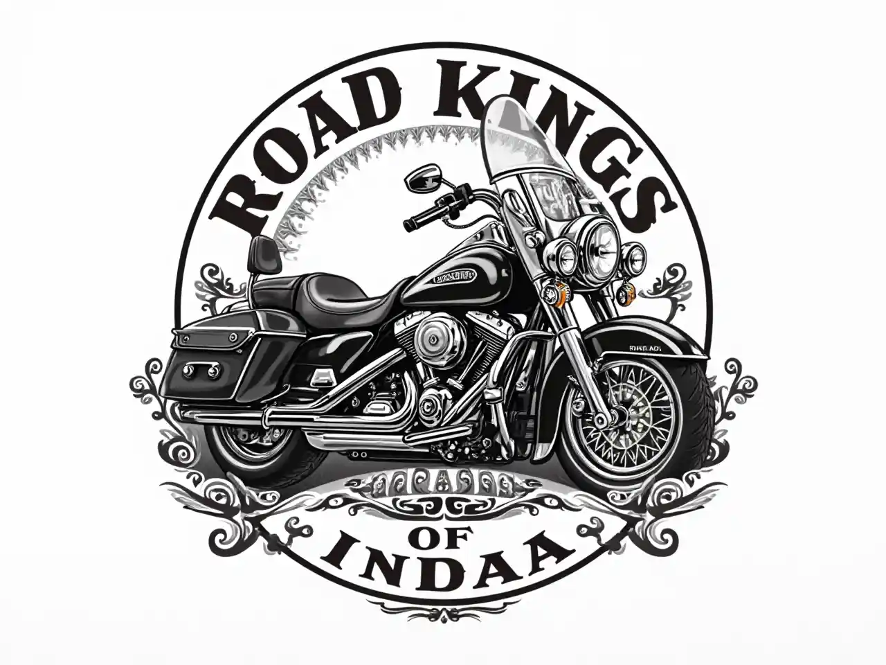Black na nyeupe alama kubuni, iconic Harley Roadking pikipiki wanaohusishwa na vipengele vinavyowakilisha India, akishirikiana na sababu za kitamaduni na alama, bold typography, style ya kisasa, mpangilio wa kitaalamu, nguvu visual, utata utata, high-definition quality, captivating design that captures the spirit of both brands with text as "Ro Kings of India" iliyo ndani ya picha