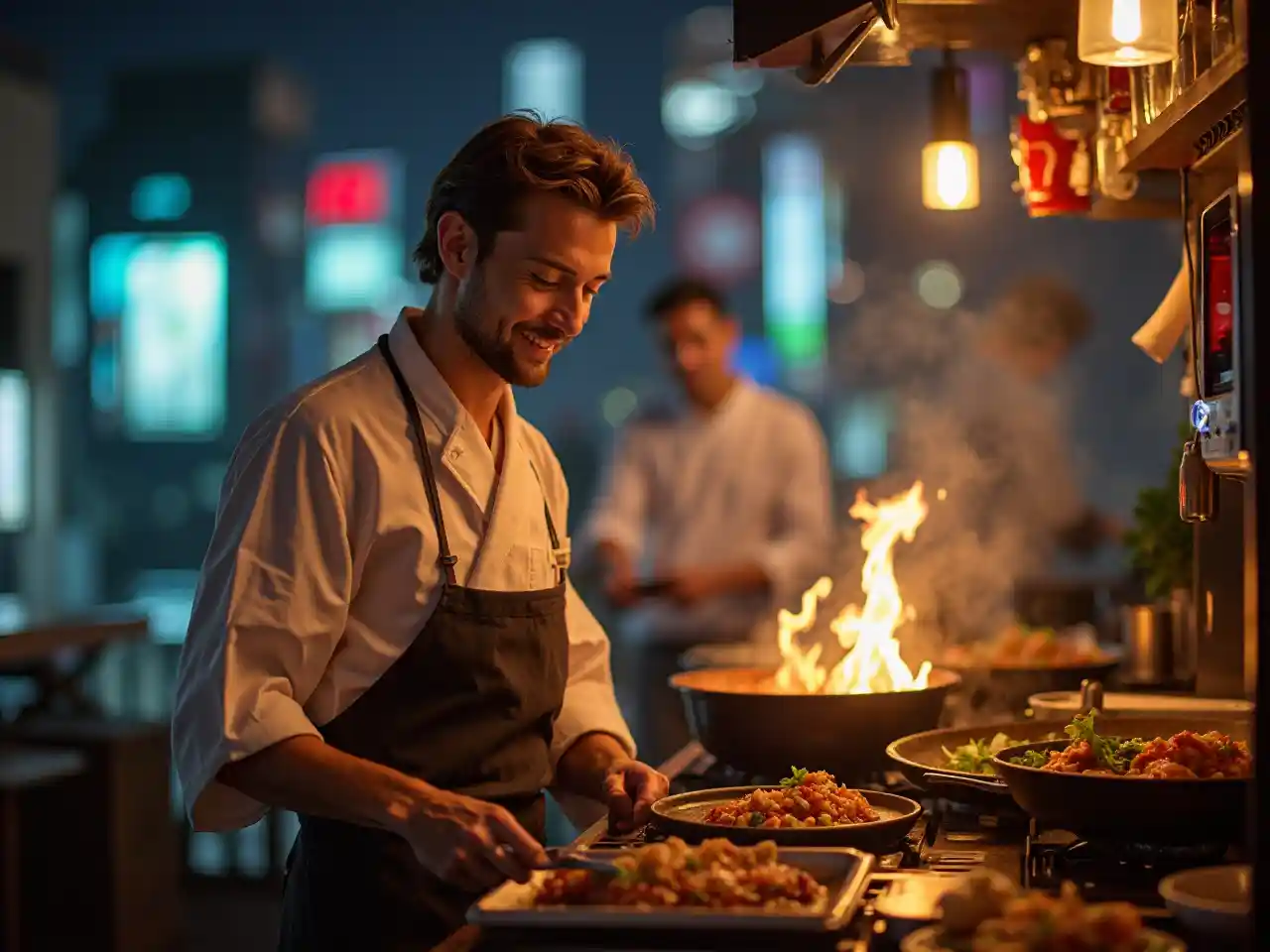 Akipika kwenye izakaya ya paa, mwanamume mweupe mwenye umri wa miaka 40 na kitu anaangaza akiwa na kimono ya mpishi. Taa za jiji na grills zenye joto humweka katika mazingira mazuri ya nje chini ya anga yenye nuru.