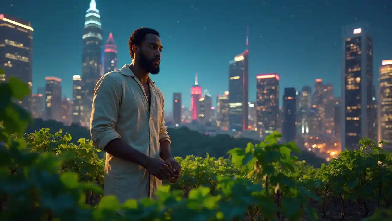 Akitunza shamba la mizabibu katika jiji lenye taa za neoni, mwanamume mweusi mwenye umri wa miaka 30 na kitu anaangaza akiwa amevaa vazi la kitani. Majengo ya kuinua mbingu na mizabibu humweka katika mazingira yenye kupendeza, na kuwapo kwake kwa utulivu kunatoa faraja ya kidunia na nguvu za jiji katika eneo la kijani-kibichi chini ya anga yenye nyota.