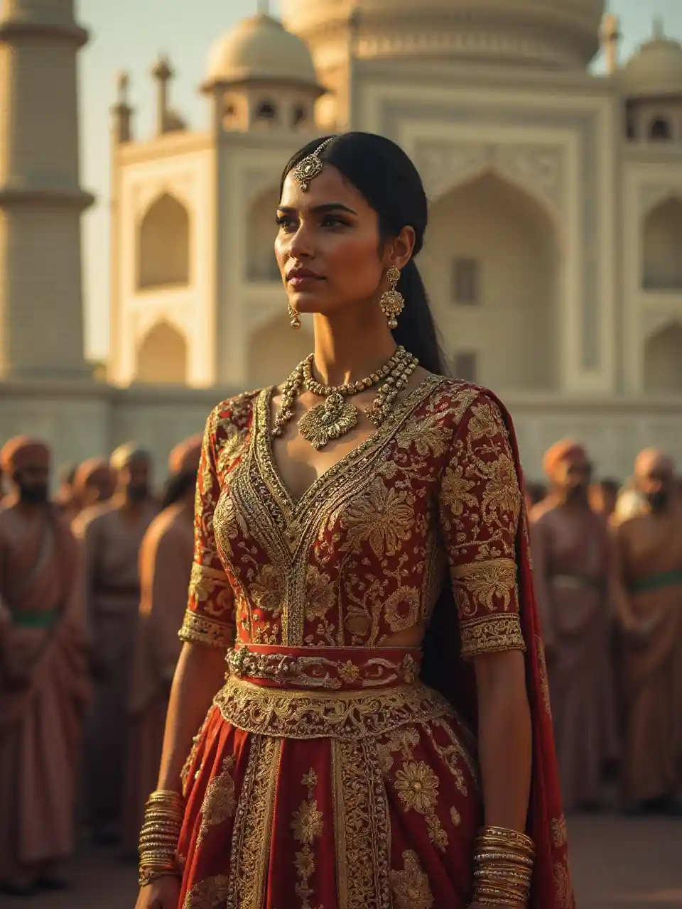 Katika miaka ya 1670 malkia mrembo wa India alikuwa amesimama kwa fahari mbele ya Taj Mahal, akiwa amevaa mavazi ya kifalme ya kitamaduni ya India yenye kupendeza na yenye kupendeza. Anavutia na ana nguvu, na uso wake wenye utulivu unavutia umati uliokusanyika. Mandhari hiyo imeundwa kwa ustadi wa sanaa, na taa zenye kuvutia ambazo huonyesha rangi ya mavazi yake na uzuri wa majengo ya Taj Mahal. Picha hiyo inapaswa kuonekana kama picha ya kitaalamu, na uangalifu wa kina katika mkao, uso, na mwingiliano wa nuru na kivuli, na hivyo kuunda hali ya heshima.