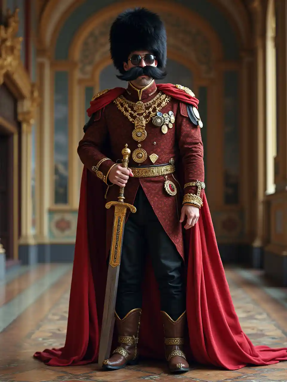 Walinzi wa Mfalme wenye ndevu nyeusi na nywele nyekundu, wakiwa wamevaa miwani, wanasimama kwa uhakika ndani ya Jumba la Ufalme wa Uingereza, wakiwa makini, wenye fahari na wenye heshima. Mavazi yake ni ya hariri yenye kung'aa na mapambo ya pekee, kutia ndani shanga mbili za shaba zilizo shingoni mwake. Jumba la mfalme lililo karibu naye lina madirisha, milango, na vitu vingine vya kichawi. Askari-jeshi huyo ana upanga mkononi, na vipuli vya dhahabu, na miguu yake imevaa viatu vya shaba na viatu vya ng'ombe