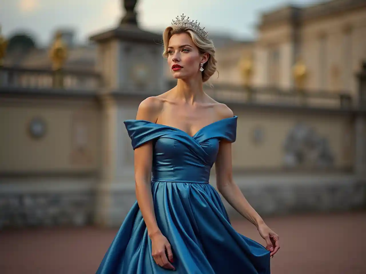 SavannahUbora wa juu sana na picha ya kweli ya binti mfalme mzuri, amevaa mavazi ya hariri ya bluu, rangi ya nyekundu, amesimama katika Jumba la Buckingham wakati wa giza, mwanga wa asili
