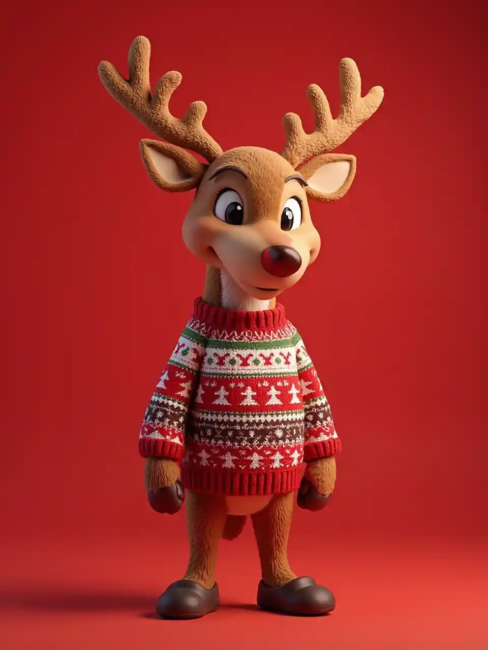Rudolph nyati amesimama amevaa sweta mbaya ya Krismasi kwenye background nyekundu