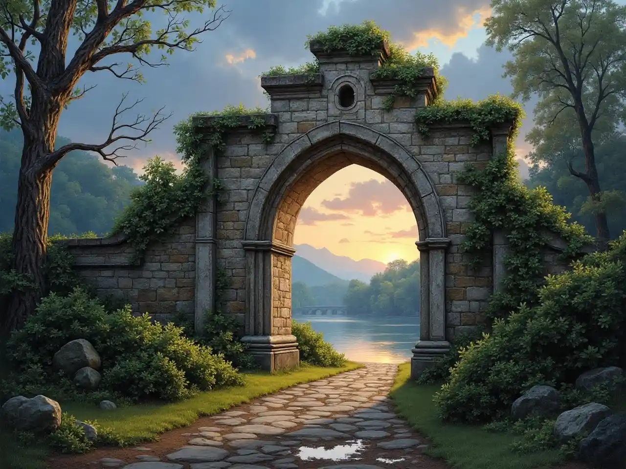 daraja la kale la mawe mbali juu ya pana, mto wavivu katika ukungu wa kuingiliana. Michoro ya mafuta ya sanaa ya mandhari nzuri ya mashambani wakati wa kiangazi, na matawi na majani yaliyoanguka baada ya dhoruba ya kiangazi kupita. Mabwawa kwenye ardhi. Anga la jioni, lenye rangi ya rangi ya rangi ya rangi ya rangi ya rangi ya rangi ya rangi ya rangi ya rangi ya bluu, hutoa hali ya kutisha lakini yenye utulivu juu ya mwingilio wa mawe uliopinda ambao umepambwa kwa michongo yenye utata, ambayo kwa sehemu imefunikwa na ivy, kama lango la ulimwengu mwingine. Miti mirefu yenye majani mabichi inaonekana nyuma, na matawi yake yanasema mambo ya siri. Njia iliyofunikwa na vichaka inaongoza kwenye mto, ambako vivuli vinacheza kwa upole. Mandhari hiyo inaonyesha historia na heshima, na kumfanya mtazamaji akumbatiwe kwa uchangamfu, na kumkumbusha kumbukumbu zenye kusikitisha lakini zenye kupendeza.