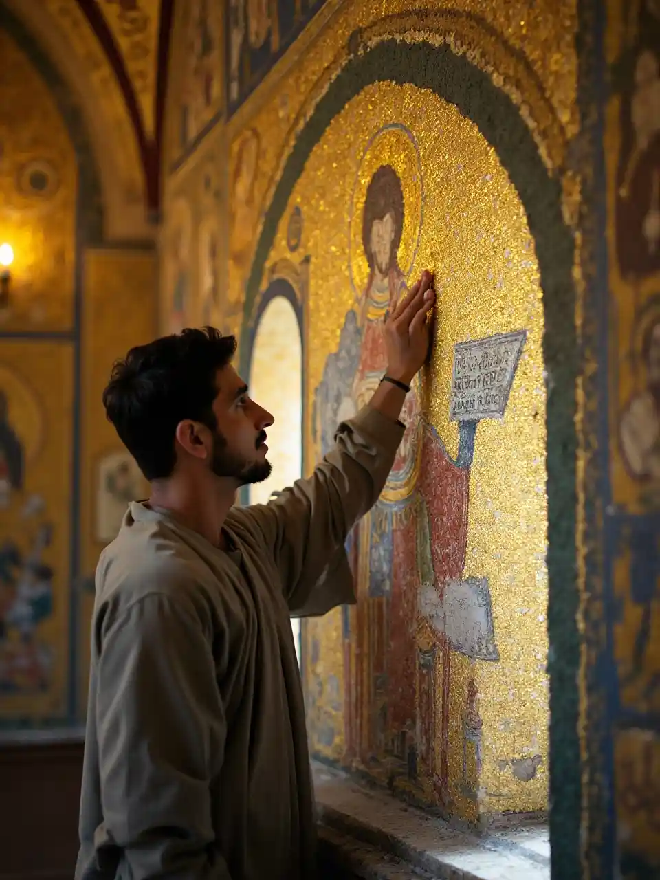 Akirudisha sanamu ya sanamu katika kanisa la Byzantine, mwanamume wa Mashariki ya Kati mwenye umri wa miaka 35 hivi anaangaza akiwa amevaa vazi la mfanyakazi. Vigae vya dhahabu na dari zenye mitaro humweka katika mazingira matakatifu, na ustadi wake wa ufundi na mtazamo wake unaonyesha kwamba ana bidii ya kisanii na ana nguvu za kihistoria.
