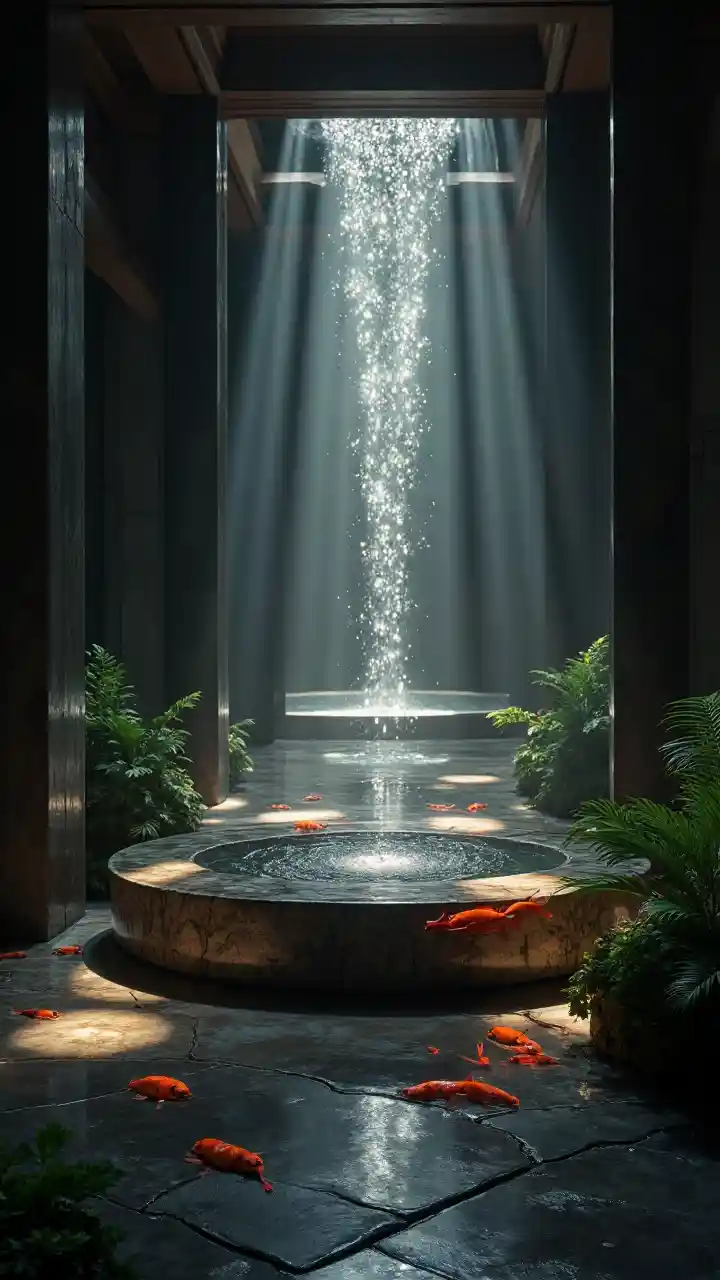 NURU ILIYOFUKIWA NA HEKALU TAKATIFU LA UPAJI NA KUSHA. Ndani ya hekalu ni alifanya kwa nguzo Ebony blackwood, sakafu ya mawe chemchemi nyeusi ya marumaru. pambo na alama ya upya na vitality, na mtiririko mkubwa wa samaki koi kutoka chemchemi ya kati (maji ni hai mtiririko na sparkling na usafi) utarati katika hewa, kutoa mwanga. Chumba hicho kinaonekana kama kipande cha mwili kilichosahaulika kutoka wakati mwingine, ambapo uponyaji wa asili na hekima ya kale huchanganyika ili kuunda nafasi yenye uzuri na utulivu.