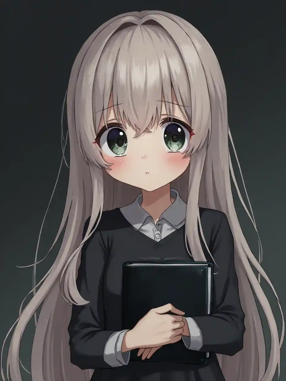 msichana huzuni anime ambaye ana sana sana sana nywele ndefu na macho makubwa sana ambayo ni kamili ya machozi na rangi ya ngozi yake ni rangi, yeye ni wasiwasi na ina albamu nyeusi katika mkono na amevaa nguo nyeusi.