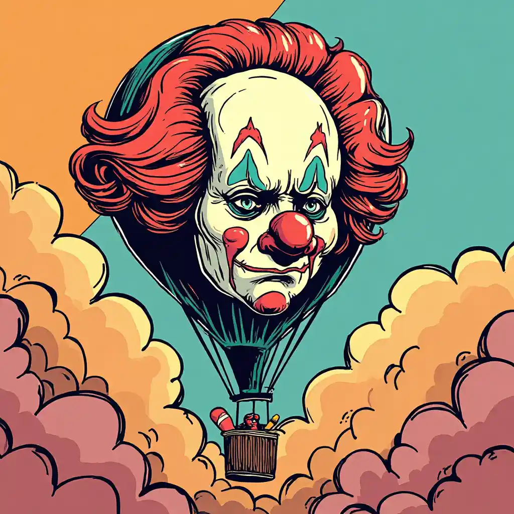 SkylarRangi pop sanaa background katika kitabu style blocks rangi na mchoro mweusi wa hewa ya joto lakini puto ni clowns kichwa na uso huzuni