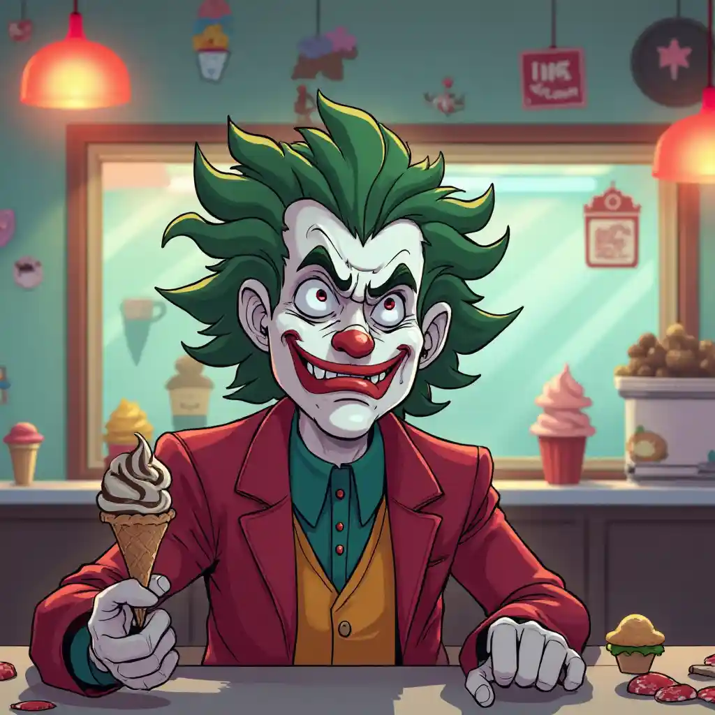Picha ya mcheza-tuo mwenye huzuni katika duka la ice cream, katika mtindo wa katuni, rangi mkali, kina cha eneo