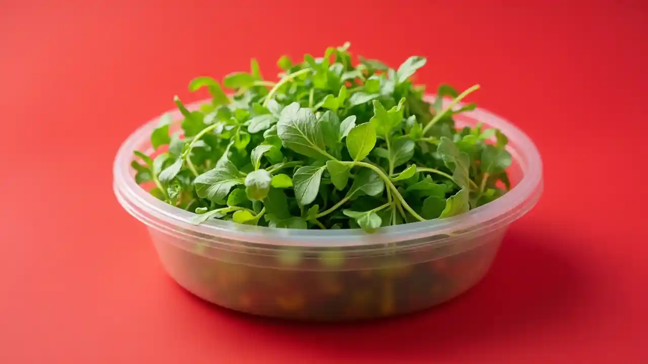 Emerytupu Transparent Plastiki Container na Salad ya Roga, kutengwa, background nyekundu, mockup, up