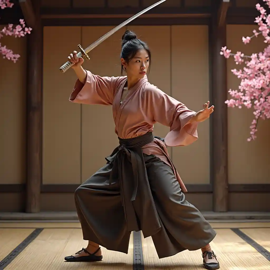 Akitenda dansi ya upanga katika dojo ya samurai, mwanamke wa Asia mwenye umri wa miaka 25 na kitu huangaza katika nguo za hariri. Kuta za mianzi na maua ya cheresi humweka katika mazingira mazuri, na hatua zake za unyoofu hutoa mvuto mkali.