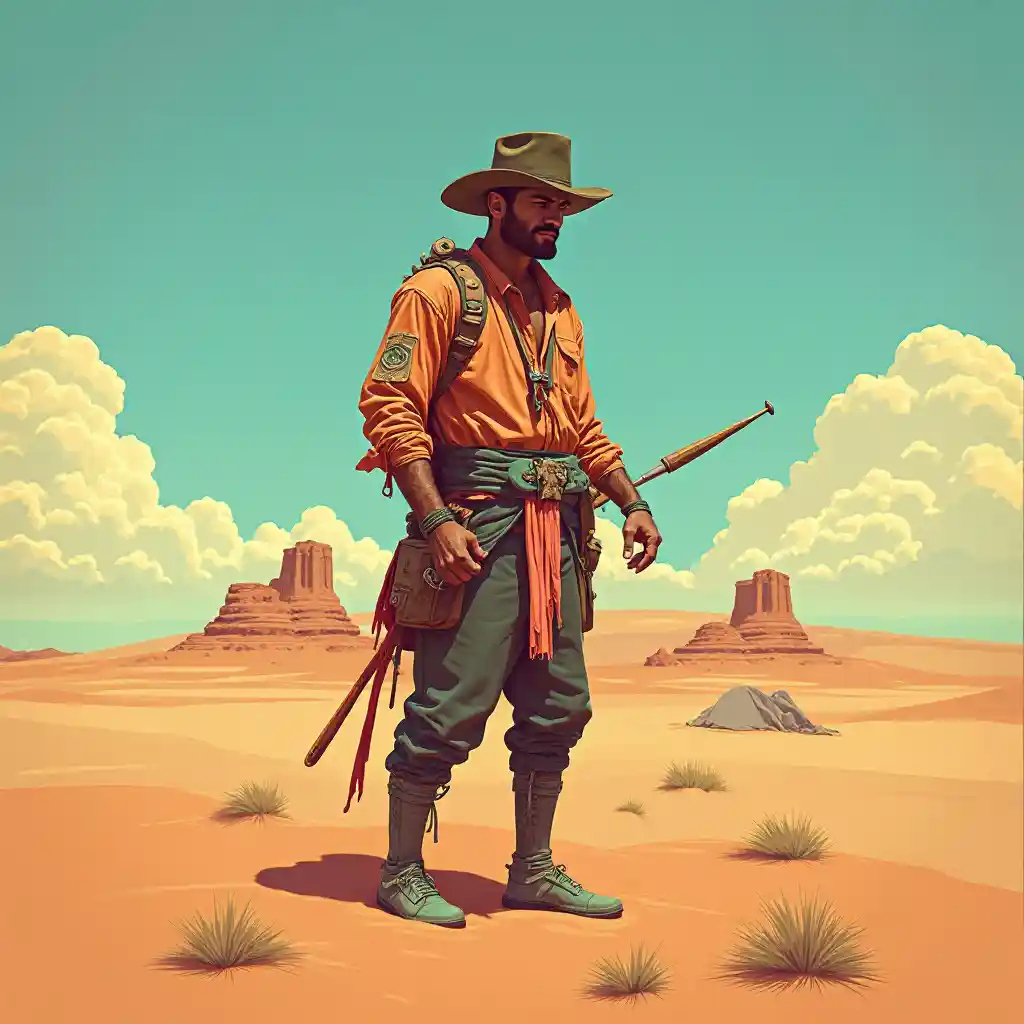 Juliananaglyph-2D ibada maisha surreal, mwili kamili ya mchanga Raiders mtu, background ni jangwa, joto rangi, picha, John Henry Alvin
