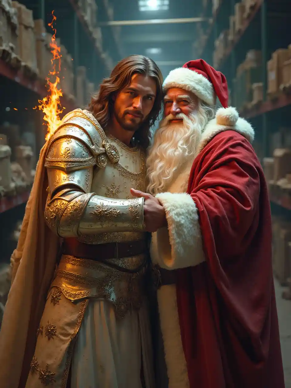 YESU KRISTO akiwa amevaa mavazi meupe yanayong'aa vita silaha na Upanga wa Moto katika mkono wake wa kushoto hugging Santa, Ultra Real, Santa's Warehouse Factory Complex Background, Shining Colors