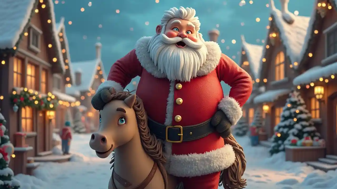 Tafadhali kuunda picha 3D ya Santa Claus ya wastani wa urefu, wastani wa plump, ndevu nyeupe na ndevu nyeupe, nywele fupi curly, macho ya bluu, amevaa costume nyekundu, katika kiuno chake amevaa ukanda nyeusi ngozi, nyeusi viatu anga, kupanda chini ya moshi mwanga. Mazingira ni katikati ya kijiji na mji ni mapambo na taa za Krismasi mapambo