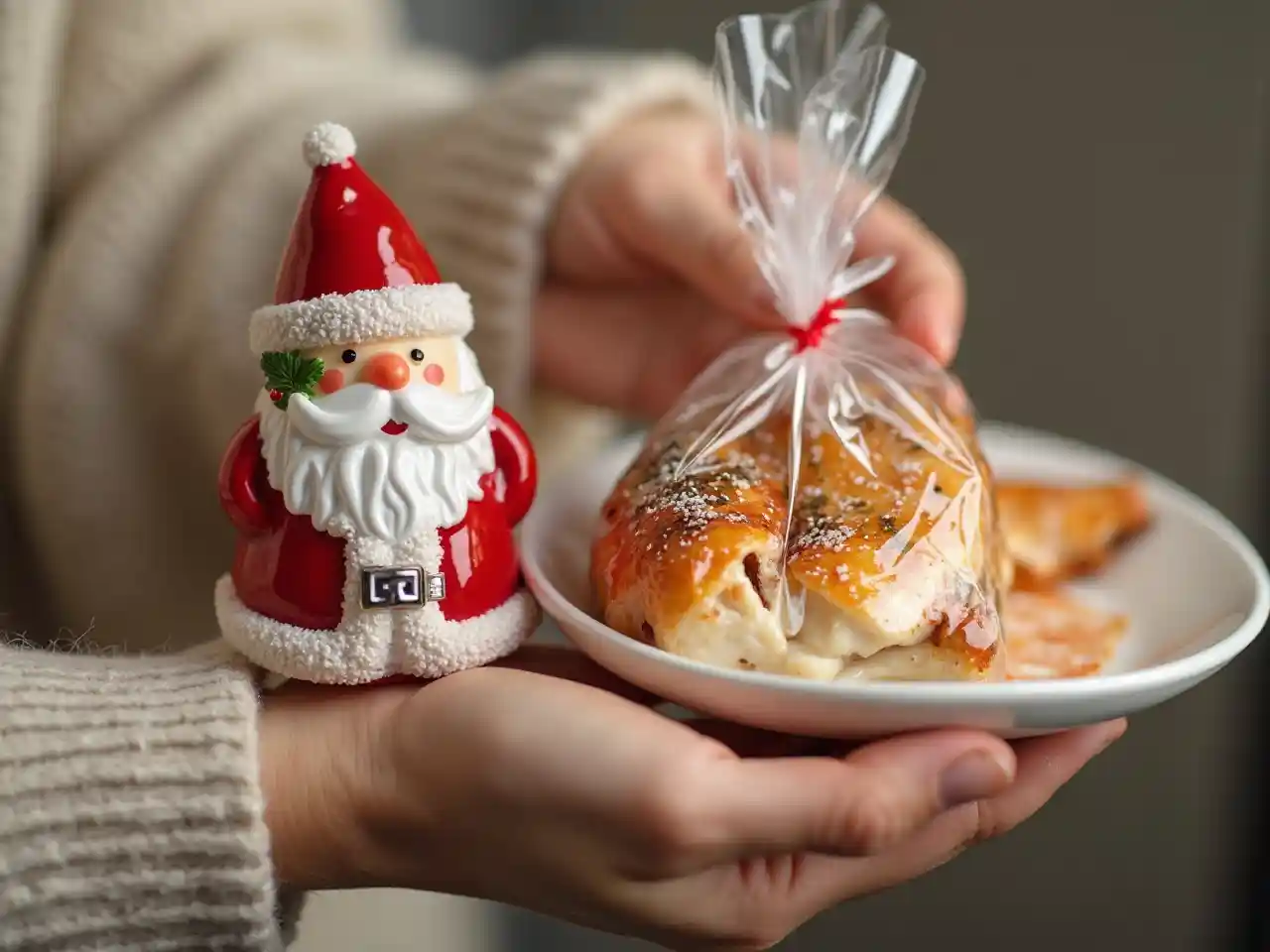 Santa Claus kioo kidogo kioo takwimu, Krismasi toy kwa ajili ya mti wa Krismasi, mfuko wa chakula waliohifadhiwa katika mkono wa kulia, cod sahani ya mkono wa kushoto.