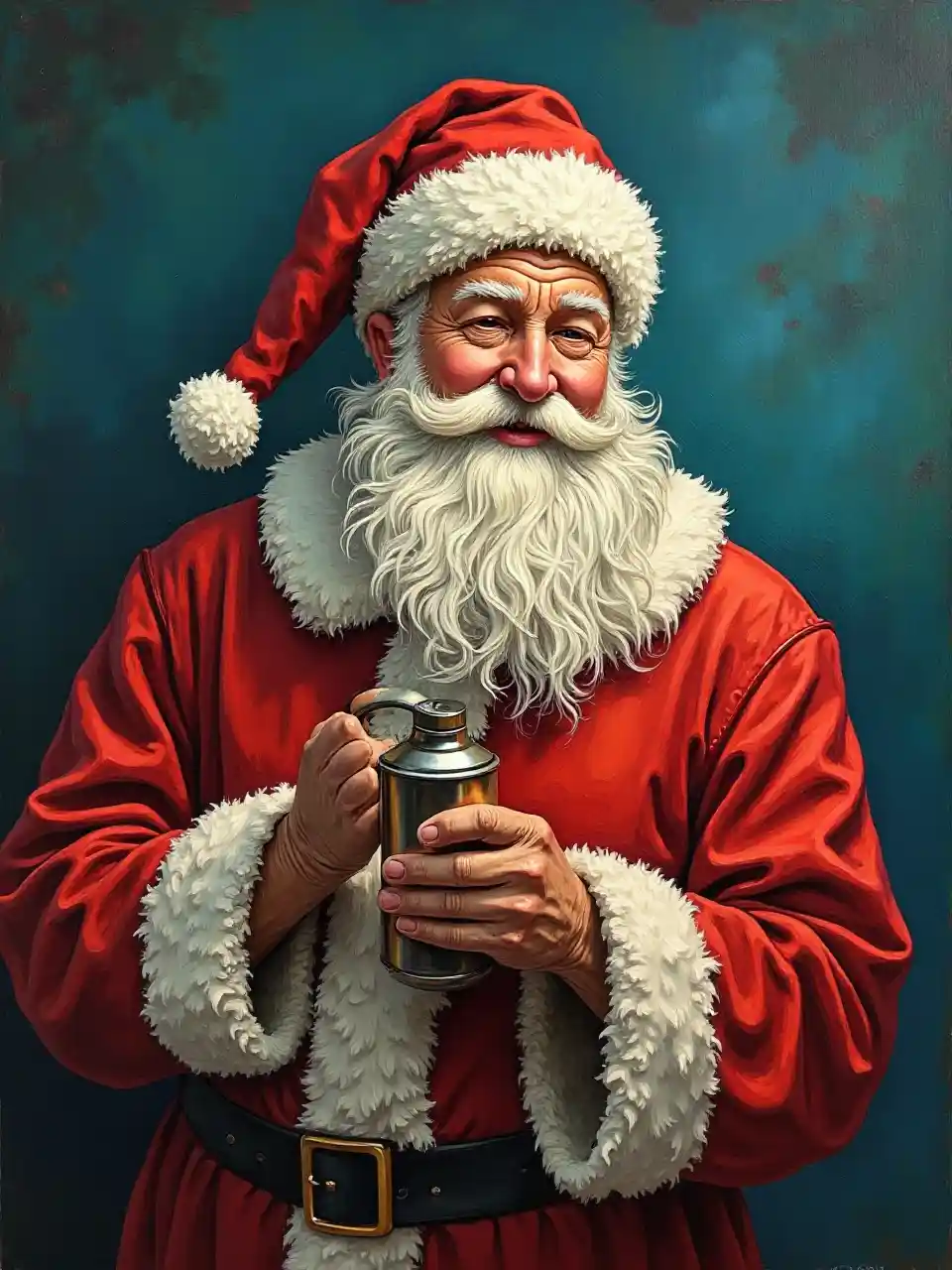 Santa Claus kushikilia mafuta ya kulehemu na mikono miwili, uchoraji mafuta, Van Gogh style