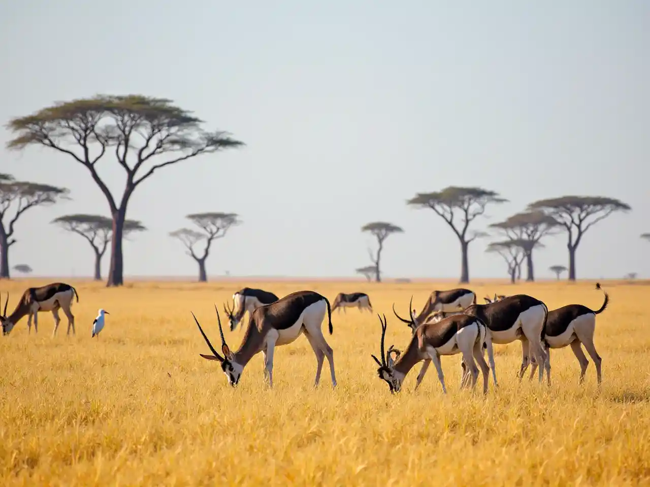 Katika eneo kubwa la kijani-kibichi lenye rangi ya dhahabu, kundi la pembe-kibichi maridadi huchunga kwa amani, alama zao zenye kuvutia za rangi nyeusi na nyeupe zikiwa tofauti na nyasi zilizo kavu. Nyuma, miti ya miberoshi inainuka kwa fahari juu ya anga la buluu, na mwinuko wa anga. Kati ya panyabuku, ndege mweupe mwenye tahadhari hutokea, akisababisha usumbufu wa hila. Nuru ya jua yenye joto huangaza mandhari kwa upole, na hivyo kuimarisha mazingira ya asili. Picha hiyo inaonyesha utulivu wa msitu, na inawatia moyo watazamaji wathamini upatano wa wanyama katikati ya uzuri wa asili.
