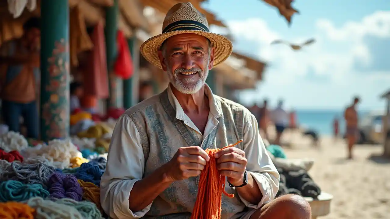 Akiwa akichonga kofia kwenye soko la pwani, mwanamume mmoja mwenye umri wa miaka 75 kutoka Amerika ya Latini, akiwa na kofia ya matete, amevaa vazi lenye mado. Vibanda na konokono hufanyiza sura yake, na sindano zake zenye kasi hutoa ufundi na fahari ya pwani katika mazingira yenye msisimko na utamaduni. Tabasamu lake linaonyesha jinsi maji yanavyozidi.