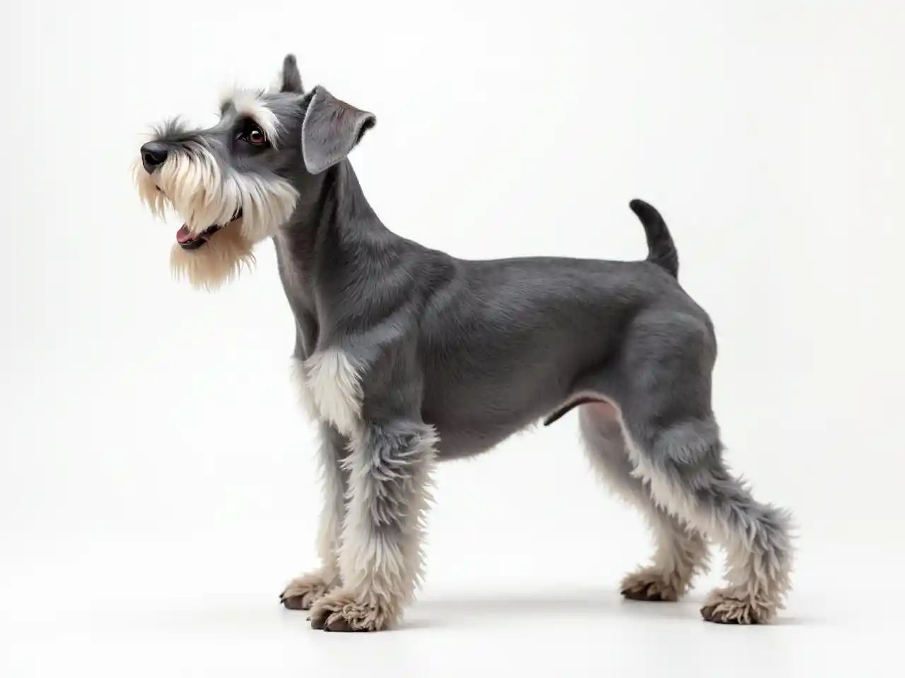 furaha Schnauzer, [safi haircut] ushindani upande picha, amesimama juu ya nne, hivyo unaweza kuona safi haircut, rangi ya kijivu, studio picha, background nyeupe, studio taa, picha ya kweli. ar 6:4] amesimama juu ya nne, hivyo unaweza kuona safi haircut, rangi ya kijivu, studio picha, background nyeupe, studio photo realistic. ar 6:4