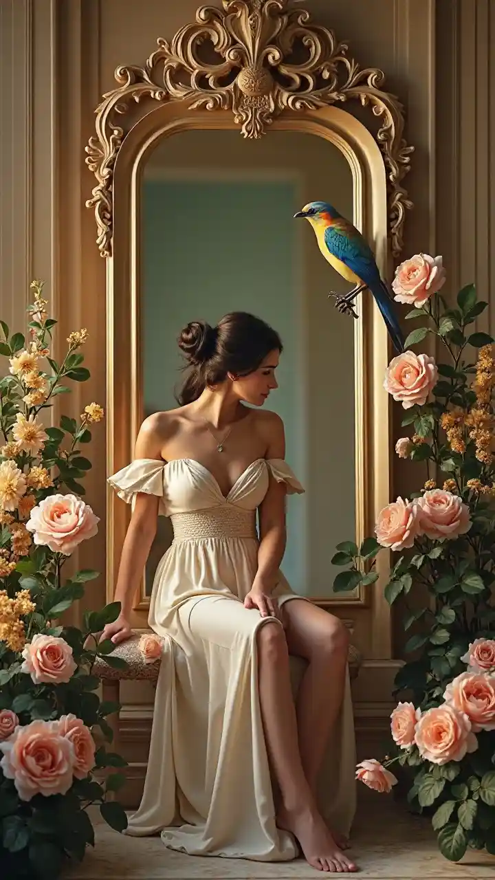 (mwanamke ameketi kwenye kiti), (mbele ya kioo), (maua mazuri na ndege wenye rangi), (ndege aliye juu ya kioo), (msimu wa neoclassicism), (msukumo wa picha), (maelezo ya sanamu ya marumaru), taa ya joto, maelezo ya juu, mazingira ya amani, mambo ya ajabu, mchanganyiko wa asili na sanaa, ubora wa 4K.