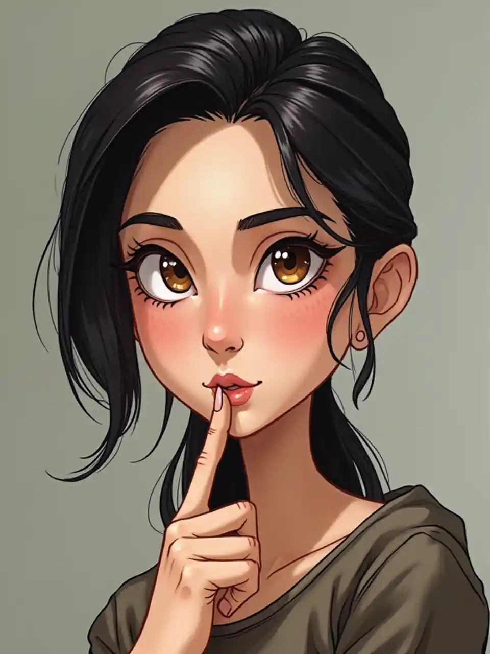 Lengo picha ya charming mchanga katuni, robo mtazamo, Yeye ana nywele nyeusi kufutwa nyuma na nywele trimmed. Ana macho ya kahawia. Ana sura nzito. Kidole cha kuongoza kiligusa midomo yake. Anaangalia moja kwa moja kwenye kamera.