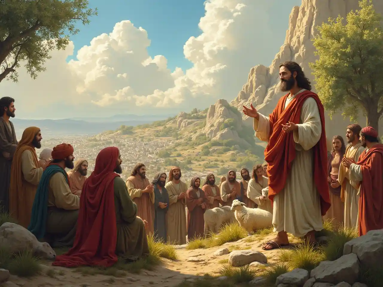Yesu akifundisha Mahubiri ya Mlimani. Anasimama kwa njia ya ajabu akitoa roho ya Mungu iliyowekwa juu yake. Mnyenyekevu lakini mtakatifu. Mwana wa Mungu aliyefananishwa na mwanadamu. Amezungukwa na umati wa watu wanaomsikiliza akizungumza. Mazingira ni mazuri. Ni mandhari ya mashambani yenye miamba ya Yerusalemu ambapo Yesu amesimama juu ya Mlima. Tukio hilo linatukia karibu na Yesu. Jiji la Yerusalemu la siku za Yesu liko nyuma. Miti ya mizeituni hukua kwenye Mlima. Na kondoo na mbuzi fulani waweza kuonekana wakila mimea inayokua katika Israeli. Yesu anavaa mavazi ya siku hiyo pamoja na mshipi.