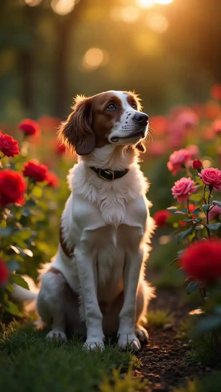 Mbwa wa Kiingereza ameketi katika bustani ya waridi. Jioni, nuru yenye joto