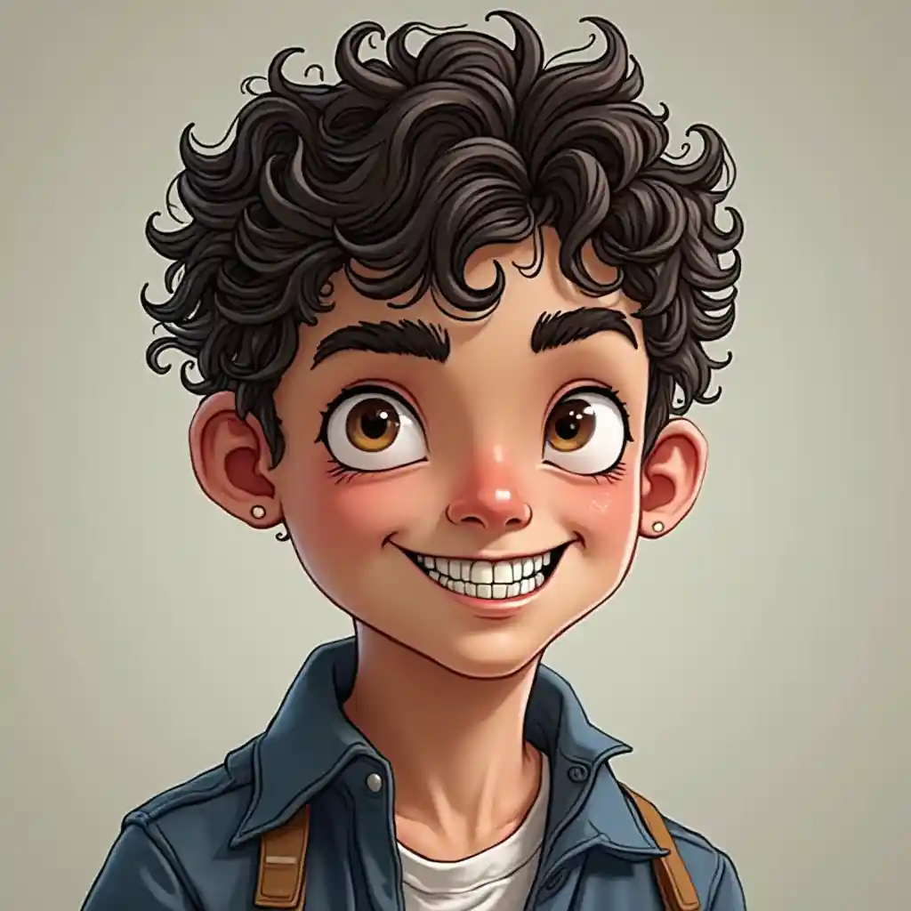 ColtenFanya kijana mwenye pua kali, nywele fupi zenye mikunjo, na vifungo vya meno na macho yenye miiba.