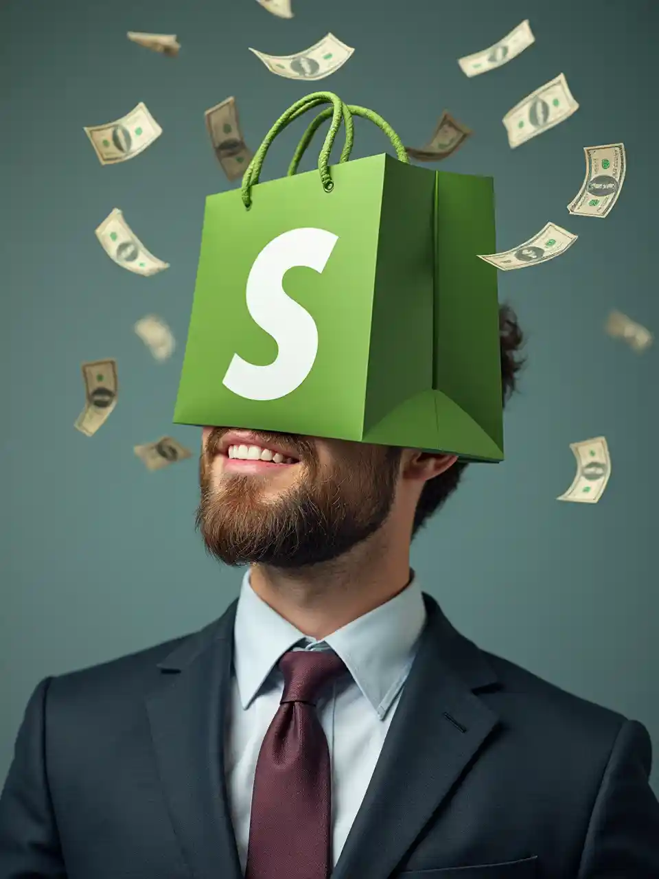 Unda picha ya mfanyabiashara mwenye umri wa miaka 25 na kichwa chake kimebadilishwa na nembo ya Shopify, na pesa zikianguka kumzunguka.