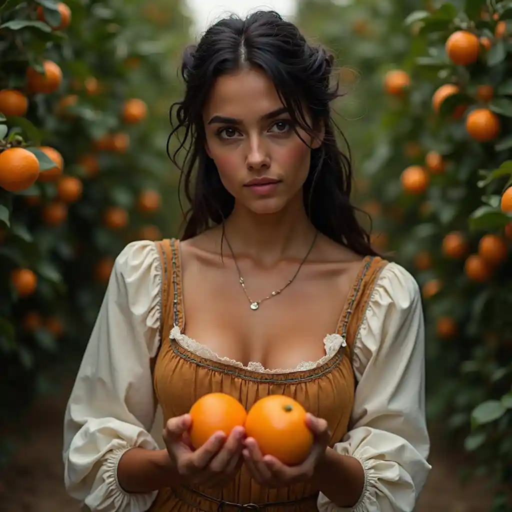 Picha ya msichana mchanga, mweusi na mzuri wa Italia anayepanda machungwa kutoka Sicily katika nguo za kijiji za karne ya 17 na shingo ya chini na matiti kamili, kina cha uwanja, miche ya machungwa. Chungwa linapaswa kuwa na umbo zuri. Maelezo ya juu sana ya kushikilia machungwa mapya mkononi
