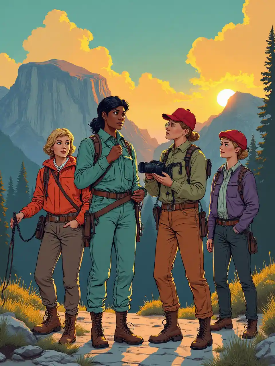 Picha ya kitabu cha kuchekesha cha screen ya hariri, picha za wanawake wa umri tofauti kutoka miaka ya 1920 na vifaa vyao, siku ya mawingu wakati wa jua huko Yosemite , rangi za rangi, picha za retro za miaka ya 1960