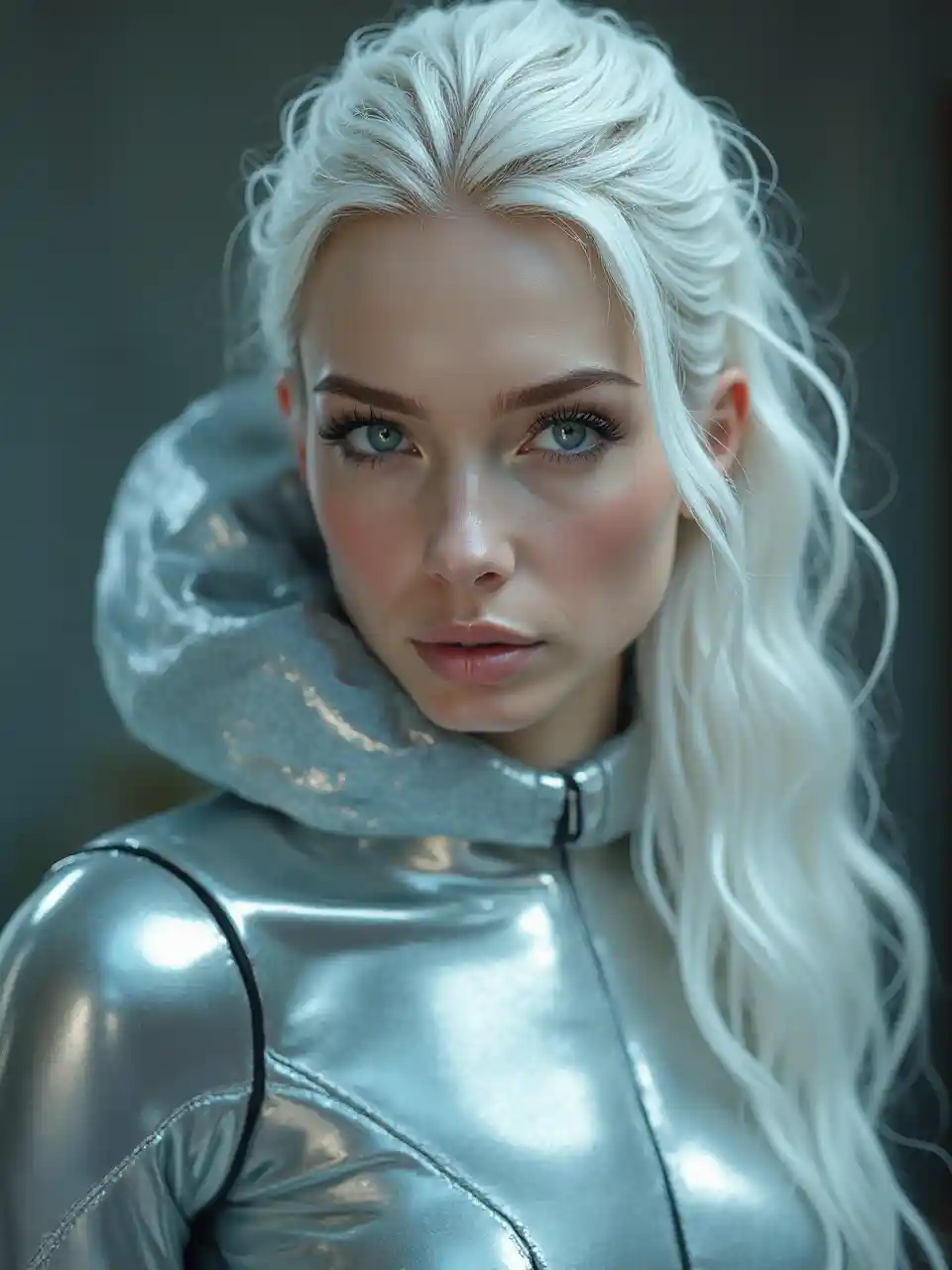 mwanamke amevaa kama surfer fedha, nywele nyeupe, (mwili mzima kuonekana), kuangalia mtazamaji, picha, ngozi ya kina, kweli, photo-kweli, 8k, kina sana, full-length frame, High detail RAW rangi, kuchoma, kuenea mwanga laini, kina cha shamba, focus kali, hyperrealism, taa ya sinema