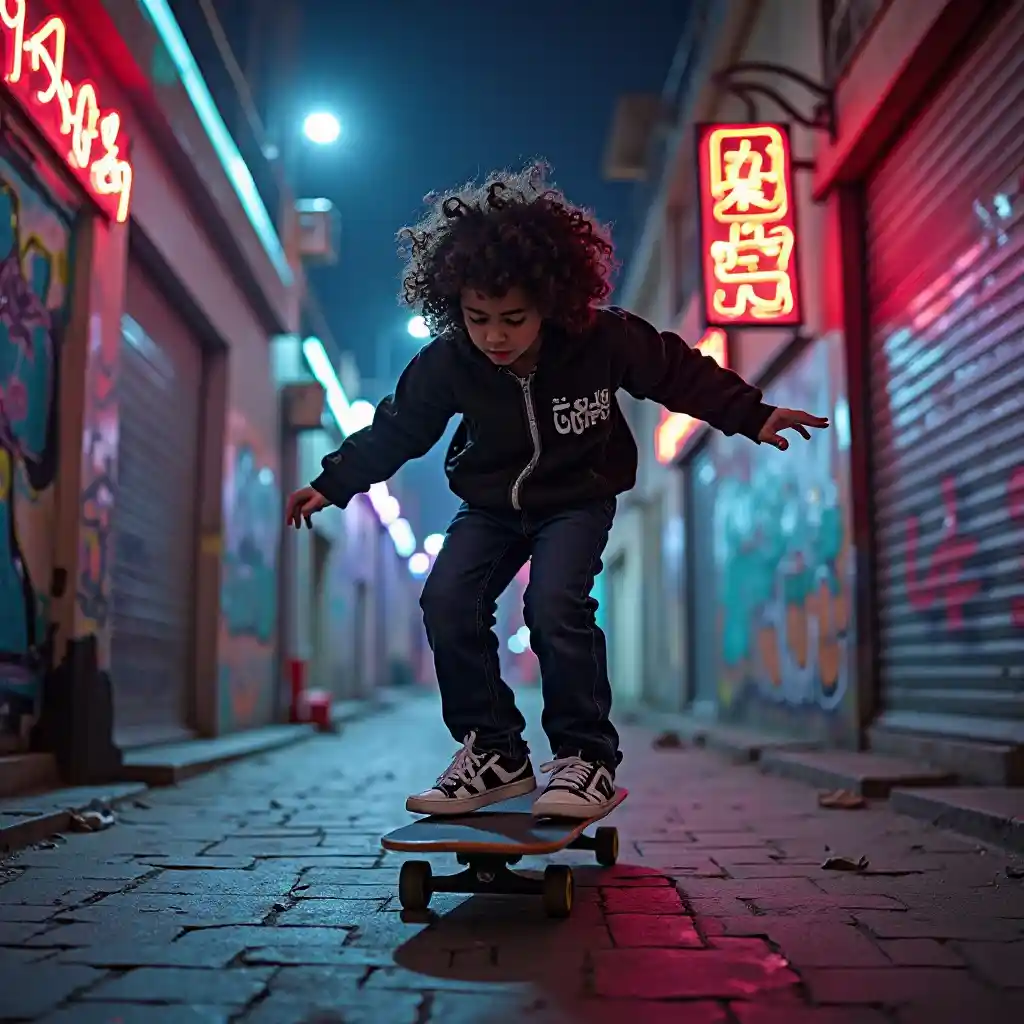 Mvulana wa Mashariki ya Kati mwenye umri wa miaka 9 mwenye nywele zenye mikunjo, akiwa amevaa suruali na viatu vya michezo, anapanda skateboard kwenye barabara iliyo na taa nyingi. Kuta zenye maandishi ya kuchongwa na ishara zinazopapasa-papasa humweka katika mazingira, na mbinu zake za haraka hutoa msukosuko na nishati ya mijini.