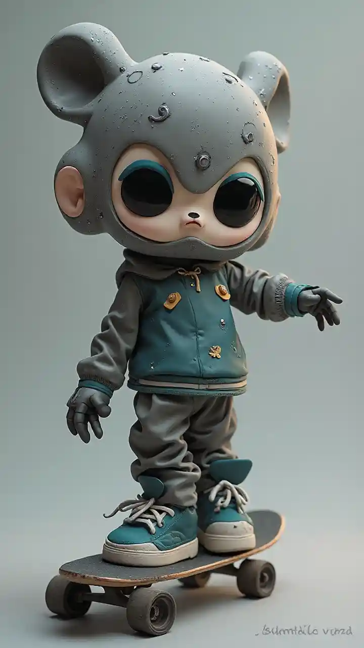 Design vinyl toy ya mtoto na mask ya calabera ya sukari sana kirafiki na mwili ndogo iliyosanikishwa kwenye skateboard kama kama yeye alikuwa imeundwa bidhaa kioo na background giza