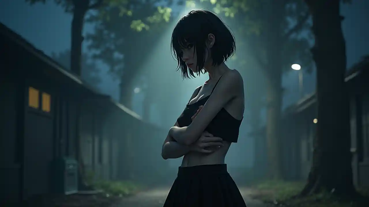 Msichana, msichana mwembamba akiwa amesimama akiwa na mikono iliyounganishwa na uso ulioazimia, akitazama chini katika eneo lenye mwangaza mdogo. Ana viungo vya tumbo na mbavu, kifua cha goro, na huvaa sketi ya A iliyo na upindo mdogo. Nywele zake nyeusi fupi zenye kuchanganya zinaangaza. Mazingira ni halisi sana na yanafaa kwa sanaa ya dhana, ikionyesha maelezo maridadi na yenye utata. Kina cha uwanja ni kuweka katika f/1.8 kutumia 85mm lensi kwa risasi katikati. Mandhari hiyo imefunikwa na ukungu wa kiasi, na hivyo kuunda hali ya hewa. Inaunga mkono esthetics inayotokea kwenye Instagram na Tumblr, iliyochukuliwa katika HDR 4k na 8k. Tabia inaonekana Asia, imeonyeshwa bila kasoro kama azimio la chini, makosa ya maandishi, au vitu vya picha. Muundo huo hauna kasoro kama vile viungo vya ziada au nyuso zilizopotoka, na hivyo kuandaa picha nzuri.
